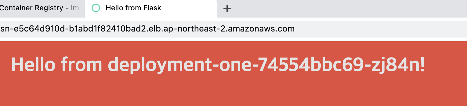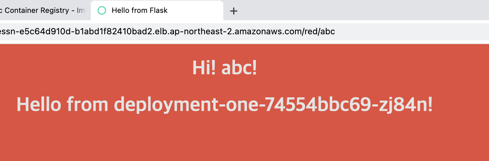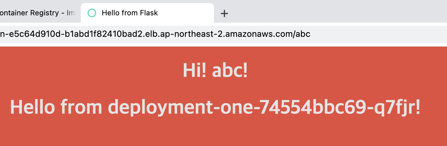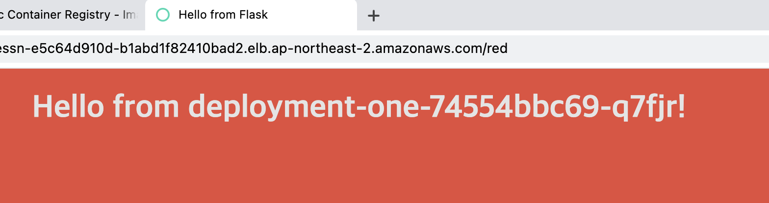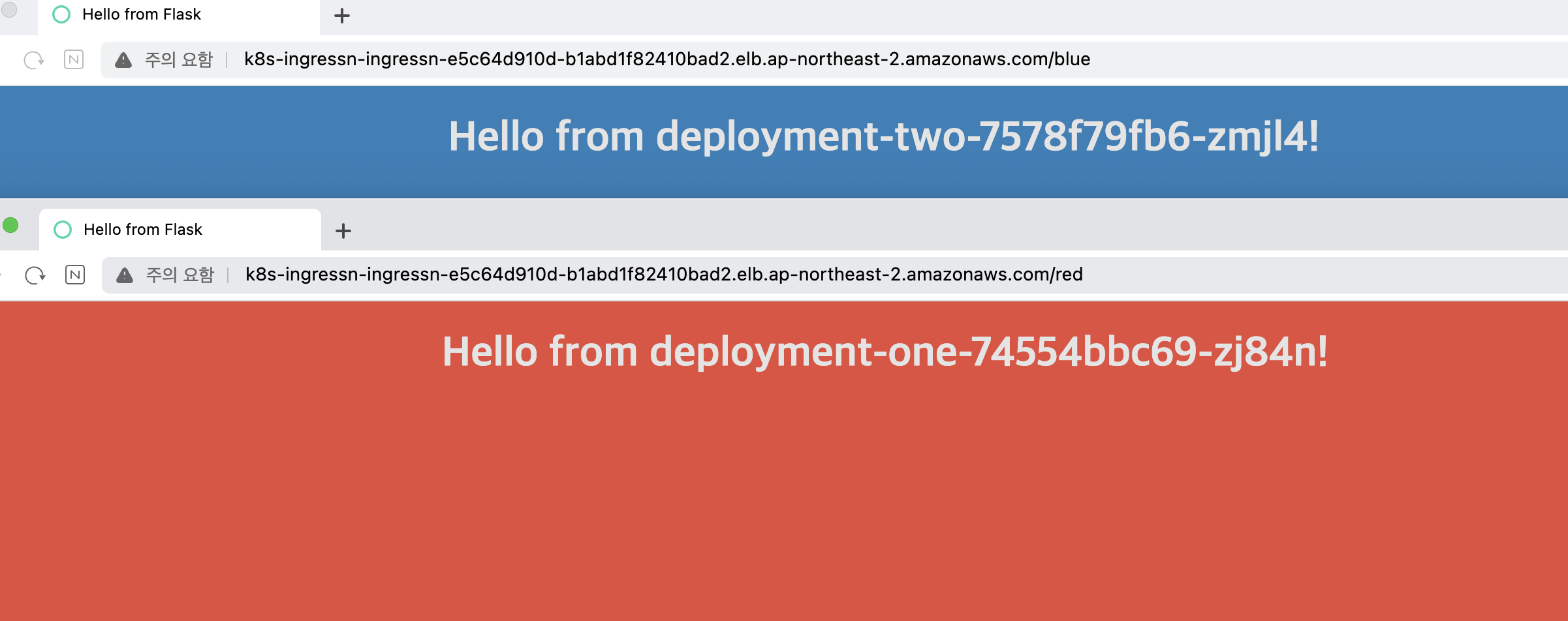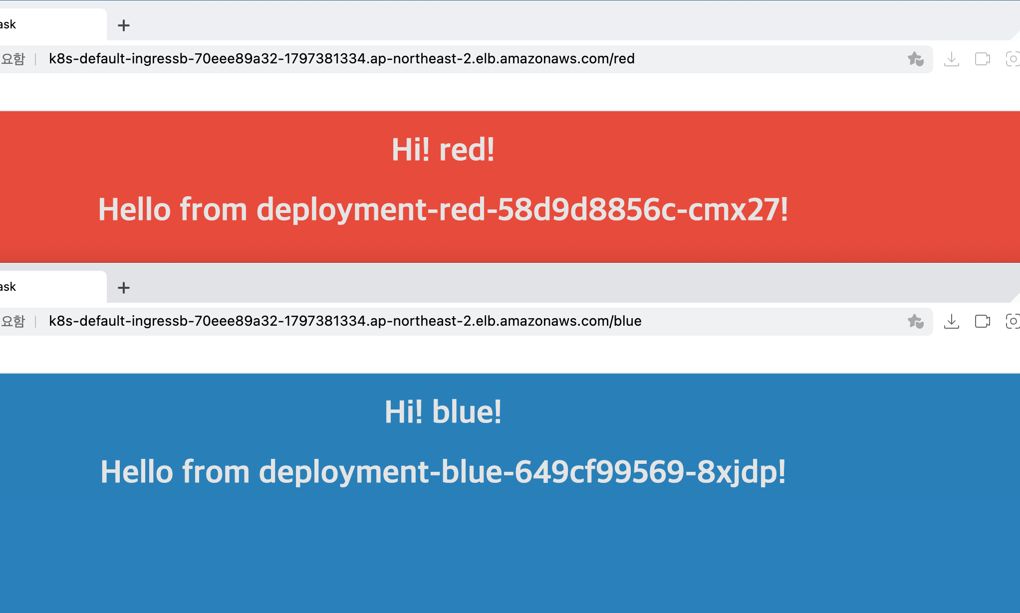 kubectl apply -f ingress-one.yaml로드밸런서의 주소로 접근하면 첫 번째 앱으로 연결됩니다.