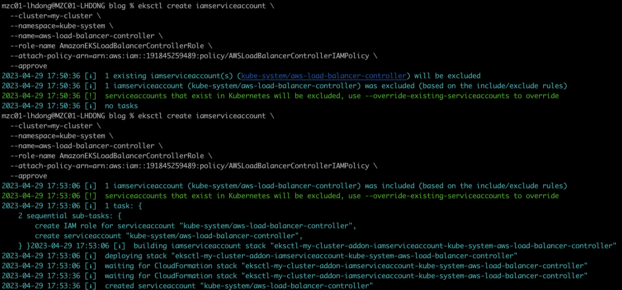 serviceaccount가 잘 만들어지지 않는다면 기존에 같은 이름의 클러스터를 생성하다 실패한 것이 원인일 수 있습니다.