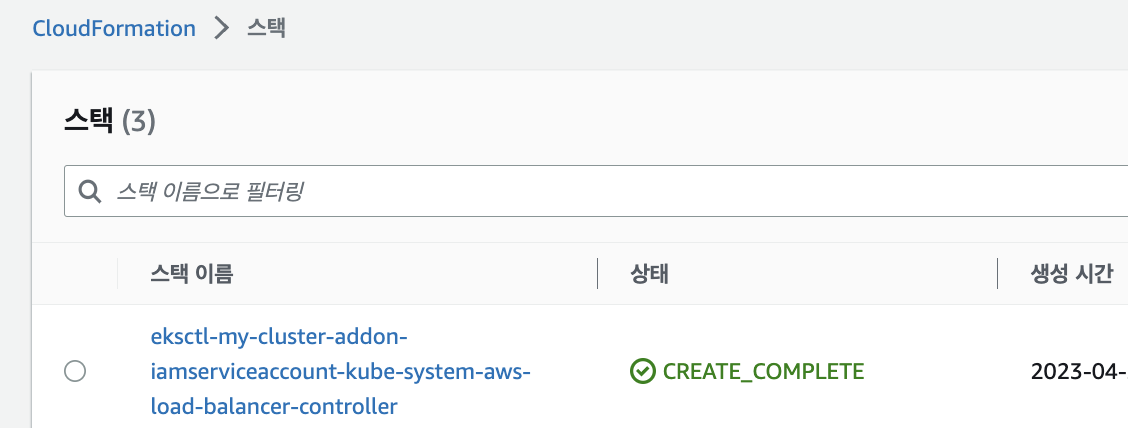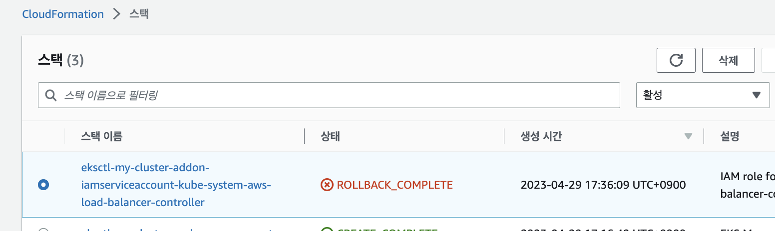 aws console에서 cloudformation에서 위와 비슷한 이름의 iamserviceaccount 스택을 지우고 다시 시도합니다.